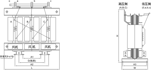 注:容量200kVA及以下不帶風(fēng)機(jī),否則在訂貨時(shí)需闡明。本表之外的規(guī)格和特殊要求可聯(lián)系洽談。