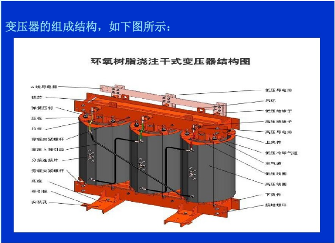 ⒊澆注式:用環(huán)氧樹脂或其它樹脂澆注作為主絕緣,它結(jié)構(gòu)簡(jiǎn)單、體積小,適用于較小容量的變壓器。